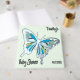 Discover the ultimate keepsake for your after delivery baby shower, a personalised guest book that radiates luxury and charm. The front cover displays a cute butterfly in a sweet trendy palette of blue and green surrounded with real silver foil. the Baby’s name is written in an elegant serif font, complemented by "Baby Shower" in an exquisite script in real foil.