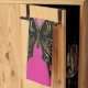 Print of a big black and gold butterfly and two smaller ones on the top of each side of it on a pink gradient background.