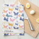 Beautiful custom name kitchen towel with a colourful watercolor butterfly pattern. Kitchen towel with personalised name in seamless delicate butterflies in pink, lilac, yellow and blue.