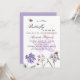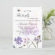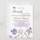 A white background. Decorated with a large butterfly, bees and painted wildflowers in violet and pink. Personalise and add a name and party details.