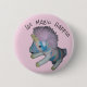 Unicorn magic depicted by a rainbow coloured unicorn doll in crochet. Mane is pink, horn is yellow, eyes are black. Curved text reads "let Magic Happen. On light pink background.