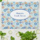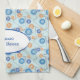 Easily personalised text is featured on this kitchen towel along with a pretty pattern of blue and orange buttons and sewing needles that would make a wonderful and handy craft room decor item.