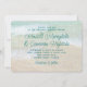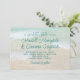 Beach background wedding invitation with bride and groom inviting guests. Include full names of the couple in teal blue script. Choose paper upgrades, or download the design to print your own.