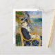A postcard with the painting, By the Seashore (1883) by the French painter Pierre-Auguste Renoir (1841-1919). A portrait of a seated young woman in a blue Victorian dress and bonnet on the beach at the seacoast. Renoir was deeply influenced by renaissance art after a trip to Italy in 1881-82.