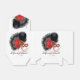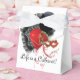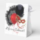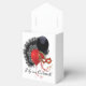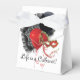 White tent-style with white ribbon favour box with a cabaret image, on the front and back, of a black feathered fan, red and black balloon, and a red mask. Optional text. We suggest changing the white ribbon to red or black satin for a more complementary look. See the entire Cancan Favour Box collection in the PARTY FAVORS section.