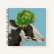 black and white cow with cabbage hat