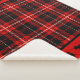 Red and black plaid with a red stripe, black moose, and trees.
