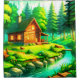 This shower curtain has a cabin in the woods on it.