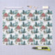 Winter scene with a cabin in woods with evergreen trees and Christmas deer, modern holiday pattern.