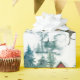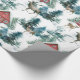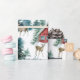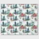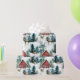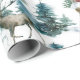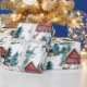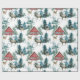 Winter scene with a cabin in woods with evergreen trees and Christmas deer, modern holiday pattern.