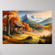 Cabin Painting: Forest Harmony and Snowy Mountain Poster