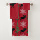 Decorate your cabin with this rustic-style bath towel set. The towel set features a moose, snowflake, and pine tree on a Christmas red background. Buy this festive towel set to update the look of your holiday bathroom or as a gift for that special someone.