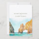 Announce your special day with this beautifully designed "Save the Date" card featuring a watercolor scene of Cabo San Lucas, Mexico. The card showcases the iconic Arch of Cabo against the serene turquoise waters, with warm sandy tones and rich golden-brown accents adding depth and character. The sky blends soft blue and creamy white shades, giving the card a dreamy and romantic feel. The combination of modern fonts with elegant script adds a touch of sophistication, making it perfect for a destination wedding celebration. The back of the card continues the watercolor style, maintaining a cohesive and artistic look that reflects the beauty of the Baja Peninsula.