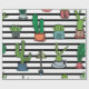 A playful and quirky pattern featuring a variety of potted cacti and succulents, each uniquely illustrated with vibrant greens and soft pastel pots. The background consists of bold black and white horizontal stripes, creating a striking contrast that highlights the lively plants. This fun and contemporary design brings a touch of nature into a modern, graphic environment.
