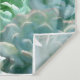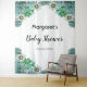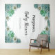 An elegant tapestry for a Baby Shower. Decorated with succulents plants, cactus, cacti flowers on a stylish white background. Flowers in silver, green and grey. Templates for the mum to be's name and date for the shower, black and grey letters.