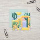 This business card features a pretty cactus garden scene that was inspired by a drive from Santa Fe, New Mexico to Phoenix, Arizona. The desert landscape features saguaro cacti, potted cactus plants, and succulents along a yellow stucco wall. A doorway leads to purple and pink hills and a setting sun. Add your name, job title, and details on the back of the card.