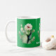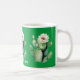 This coffee mug is decorated with three beautiful cacti, cactuses on a green background with the words "handle with care" below the centre cactus.