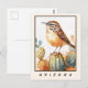 This postcard features watercolor art of a cactus wren perched on the thorny succulent. The bird artwork is framed by a dark border, and the word 'Arizona' is beneath it, indicating the small desert songbird as the state bird.