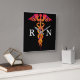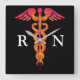 ● Caduceus design in colourful hot pink, orange and gold yellow on wall clock with "RN" in white letters This clock has the grey time