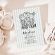Cute whimsical hand drawn 'Cafe Bebe' French cafe inspired baby shower invite with a soft blue striped background and a hand drawn illustration of a cafe in Paris.