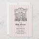 Cute whimsical hand drawn 'Cafe Bebe' French cafe inspired baby shower invite with a soft rose striped background and a hand drawn illustration of a cafe in Paris.