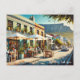 This painting captures a street view of an everyday scene at a small local cafe in Cape Town, radiating warmth and community spirit. Patrons are seated at wooden tables under umbrellas, sipping coffee and engaging in conversation, while passersby stroll along the vibrant street. The cafe’s minimalist facade features African-inspired patterns and earthy tones, harmonising with the colourful buildings and lush potted plants that line the street. In the background, the majestic Table Mountain provides a breathtaking natural backdrop. The palette of bright blues, greens, and yellows, paired with soft sunlight casting gentle shadows, creates a lively yet relaxed ambiance.