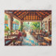 This painting captures an everyday scene at a cosy cafe in Goa, exuding a relaxed and tropical vibe. The cafe features a thatched roof and an open seating area surrounded by lush greenery. Patrons are seated at wooden tables, enjoying coffee and Goan delicacies in the serene ambiance. Large windows and open spaces reveal vibrant streets lined with palm trees and traditional colonial-style houses painted in bright hues. The decor includes natural wood furniture, hanging lanterns, and colourful tiles inspired by Goan-Portuguese design. The earthy tones, vibrant blues, and lush greens, illuminated by soft natural light, create a harmonious and inviting setting that reflects Goa's charm.