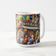 The painting captures a charming and animated street scene at a small café in Mumbai. It's a sunny day, and the café buzzes with activity. People of various ages, including a young couple sharing a laugh over coffee and an elderly man deeply engrossed in his newspaper, fill the scene. The street is lively with vendors selling colourful crafts and street food, adding a dynamic element to the everyday life depicted. The café itself is quaint, with vibrant decorations and lush plants surrounding the seating area, contributing to the welcoming atmosphere. The architecture reflects the local style, with intricate carvings and a bright palette of colours enhancing the visual appeal of the scene.