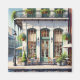 This painting captures a cosy cafe storefront in New Orleans, beautifully blending modern simplicity with the city’s historic charm. The cafe features large glass windows framed by intricate wrought iron, a colourful brick facade, and a minimalist sign above the entrance. Hanging flower baskets and lush greenery add a fresh and inviting touch, while a small outdoor seating area with modern wooden tables and chairs lines the cobblestone sidewalk. The backdrop showcases the unique French-inspired architecture of New Orleans, including ornate balconies and hints of the vibrant street life. The bright, clean palette of crisp whites, warm brick tones, and vibrant greens highlights the lively yet relaxed atmosphere, perfect for enjoying coffee in this picturesque setting.