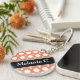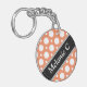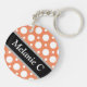 Modern 2-sided round acrylic keychain with an assorted polka dot pattern with alternating sizes of white circles over a cafe-style orange. Your name or custom text is printed diagonally in white over an off-centred diagonal black stripe on both sides.