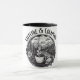 A black-and-white vintage illustration featuring a steaming coffee cup set in a scenic camping landscape with mountains, trees, flowers, and a flowing river.