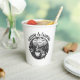 A black-and-white vintage illustration featuring a steaming coffee cup set in a scenic camping landscape with mountains, trees, flowers, and a flowing river.