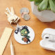 A circular keychain featuring a cartoon zombie holding a coffee cup that reads "Caffeine Keeps Me Alive," with "Caffeine" in a dripping font above its head.