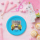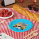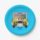 These cute paper plates have a graphic illustration featuring a pair of cartoon cake characters wearing chequered oven mitts facing off with wooden spoons in front of a stainless steel oven door with a cake baking inside. Easily customised for your kitchen contest or competition.