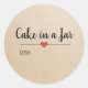 Modern "cake in a jar" sticker with a black script font on a kraft paper background embellished by a cute red heart. Customise text.