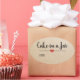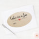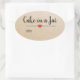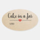 Modern oval "cake in a jar" sticker with a black script font on a kraft paper background embellished by a cute red heart. Customise text.