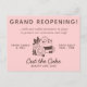 Cake Logo Bakery Business Grand Reopening Postcard. This design features an elegant cake logo on a pink background. Perfect for bakeries, cake and pastry shops, cafes, caterers, restaurants or any food service related business reopening amid covid 19 and coronavirus.