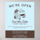 Cake Logo Bakery Business Reopening Poster. This design features an elegant cake logo on a blue background. Perfect for bakeries, cake and pastry shops, cafes, caterers, restaurants or any food service related business reopening amid the covid 19 coronavirus crisis.