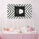 Coordinates with the Cake Monogram Logo with Mod Stripe Pattern Bakery Business Card Template by 1201AM. Your initial or business initial is set in a fun cursive script on a silhouetted cake shape for the perfect logo. Set on a bold, modern black and white stripe pattern for a fun aesthetic. Great for bakeries, catering companies, dessert chefs and more. Use this customisable banner for signs, food stand banners, events and more. © 1201AM CREATIVE