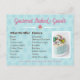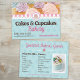 An attractive double-sided postcard for bakeries that bakes cupcakes, cakes, desserts and other baked goods. It has a cupcake print background in blue, and allows you to edit the images with your own baked goods (or use the ones on the flyer). Editable text includes your phone number, email, website, and on the back your bakery menu and list of flavours. Great for handing out at markets, bakeries, stores, customers, and at a size to mail out for advertising.