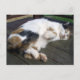Calico cat curled up on the decking postcard