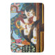 Calico cat playing with a red Chinese dragon in front of a peacock stained glass window.
