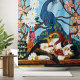 Calico cat playing with a red Chinese dragon in front of a peacock stained glass window.