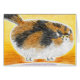 A detailed, colored line drawing of a prominent, round, alert and alarmed fluffy orange and black calico cat flutters and floats above the ground, against a yellow-orange blended background, above a violet shadow.