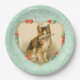 Adorable Victorian Calico kitten with heart border and paintbrush. Coordinating background is pastel aqua with lace like hearts pattern. Small heart accents in light green and coral. Customise with a name or other text, or delete if you prefer.
