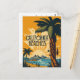 California, palm tree on the beach, sunset on the distance, behind the mountains. Travel postcard in vintage style.