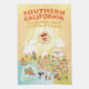 Charming cartoon of Southern California – Los Angeles, Anaheim, Long Beach, San Diego with classic California scenes - a surfer hangs ten while a mermaid lounges on a rock, a killer whale leaps out of the water, a muscular beach couple both flex to impress, zoo animals wait for tourists and a bull smashes into a bull fighter…