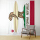 The "California Flag Surfing Bear" tapestry features Monarch the bear carrying a surfboard west towards the waves, set against a pure white background with the definitive red stripe and the iconic red star. This tapestry is the perfect statement piece for any room in your home, adding a touch of California cool to your décor.