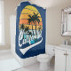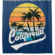 California shower curtain with a retro design that features a sunset and palm trees on Old Glory Blue customisable background colour. This design also has California in a handwritten font with a swash tail glyph for that stylish retro look. This shower curtain is just for you if you are from California or you can get as a gift or souvenir for someone.