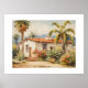 Spanish colonial style home with palms and agave, bougainvillea in painterly watercolor style. This illustration was made with a combination of ai and photoshop.